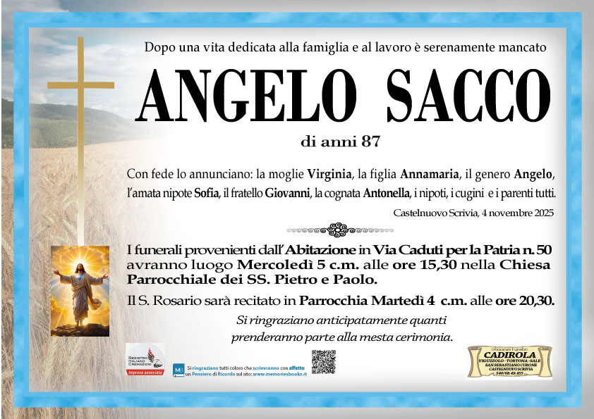 "Non piangete la sua assenza, sentitevi vicino, parlategli ancora, Vi amerà dal cielo come vi ha amati sulla terra". (Sant’Agostino) Ci uniamo al dolore di Virginia e di Annamaria per la perdita del caro Angelo, ricordandolo con una preghiera. Sentite condoglianze.
