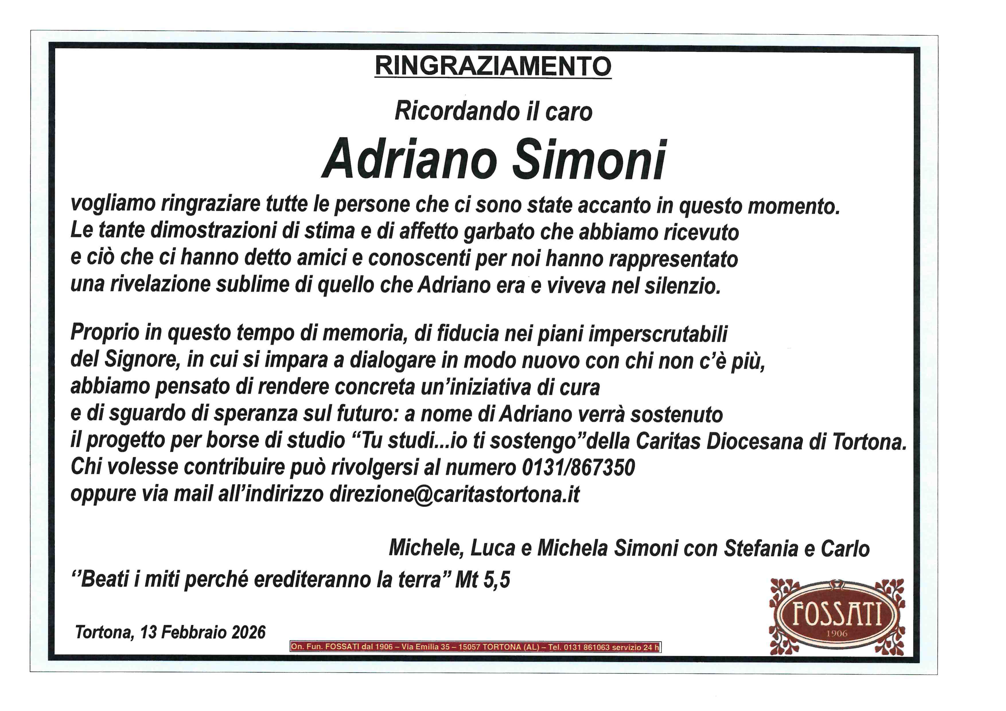 Ricorderemo sempre il caro Adriano come persona dolce, riservata e discreta che troppo presto ci ha lasciato. Siamo vicini alla famiglia e garantiamo il suo ricordo nelle nostre preghiere